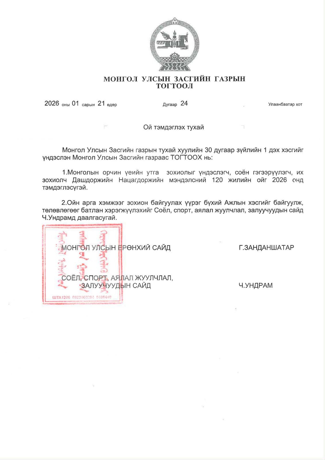 Их зохиолчийн Монголын соёл, утга зохиолын түүхэнд гүйцэтгэсэн үүрэг, оруулсан хувь нэмрийг олон нийт, ялангуяа залуу хойч үед сурталчлан таниулах зорилгоор “Ой тэмдэглэх тухай” Засгийн газрын тогтоолын төслийг боловсруулж, 2026 оны 1 дүгээр сарын 21-ний өдрийн Засгийн газрын хуралдаанаар хэлэлцүүлэн батлууллаа.